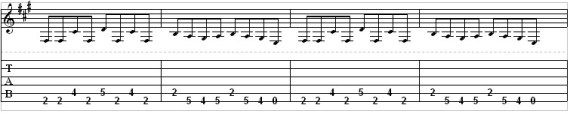 The riff of Crazy Train is based on a pattern of notes that comes from the F# Minor Scale (also known as the Aeolian Mode). Because of  its “dark” or “somber” sound, the minor scale is a very common scale that guitarists who play “heavy” or “aggressive music like to  play. The rhythm of the riff of Crazy Train is composed in all eighth note.  (See image below)