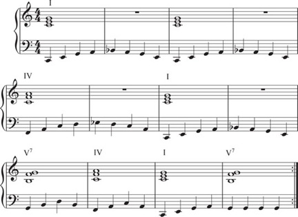 The first 4 bars just use the I chord – I, I, I, I.